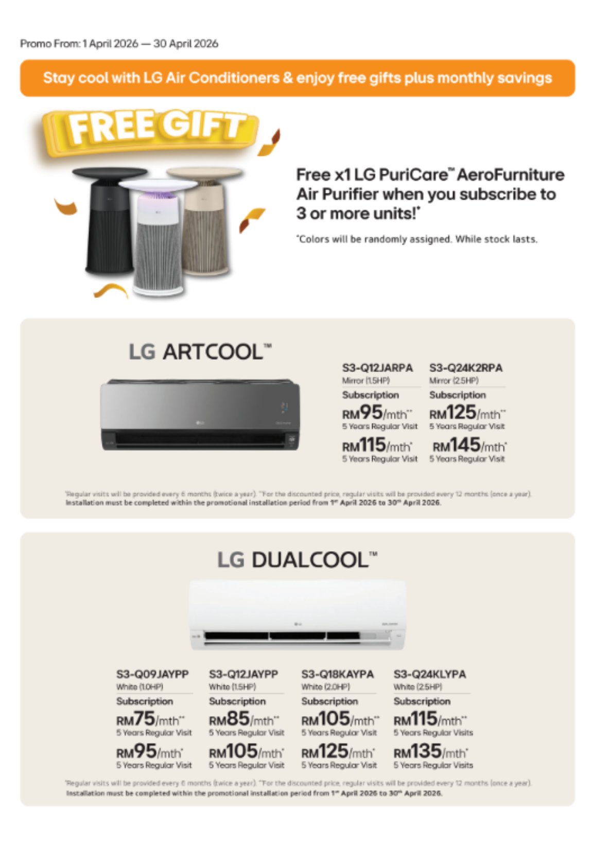 Get LG’s cooling deals, including 5 years maintenance service, for as low as RM75 per month!