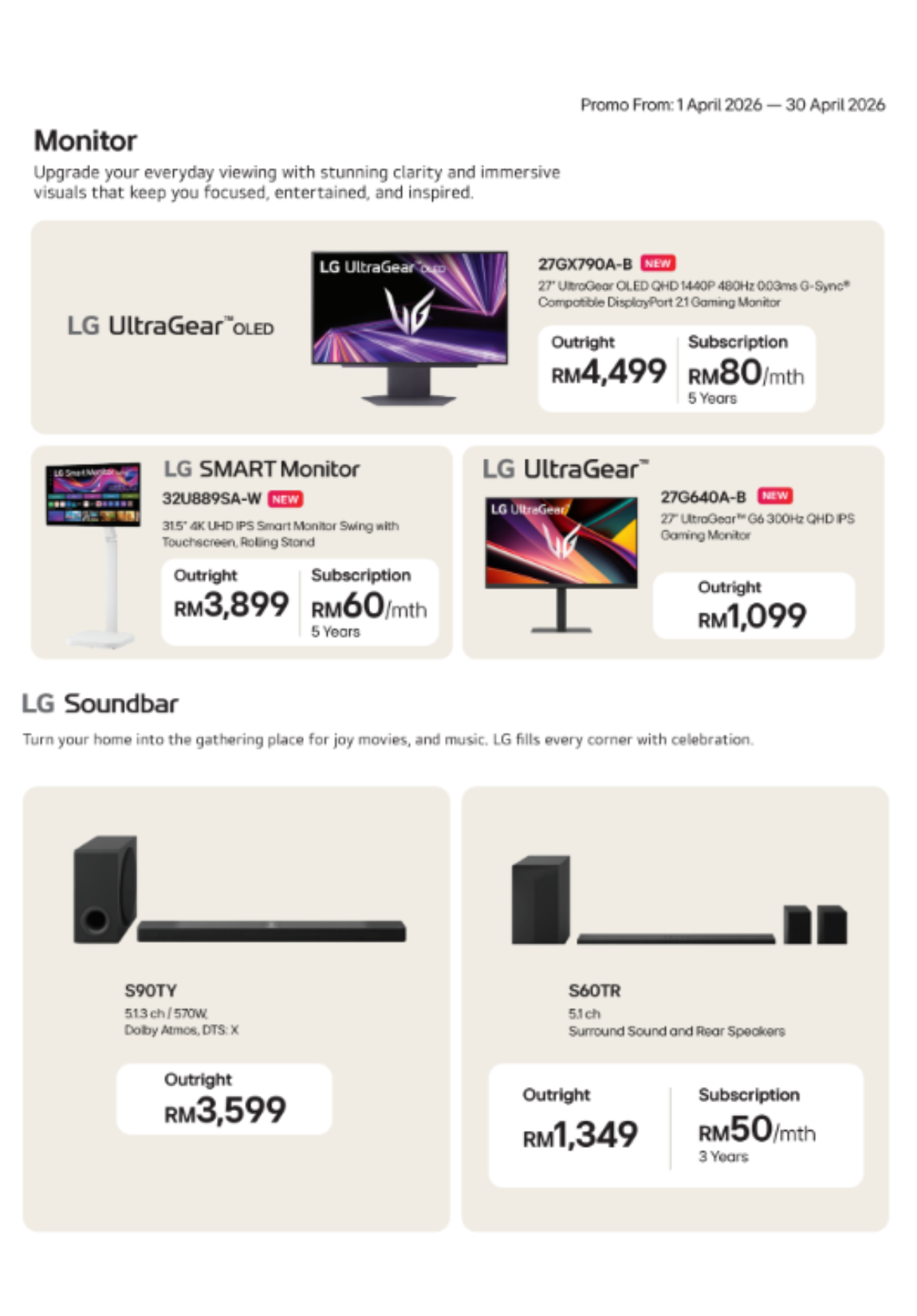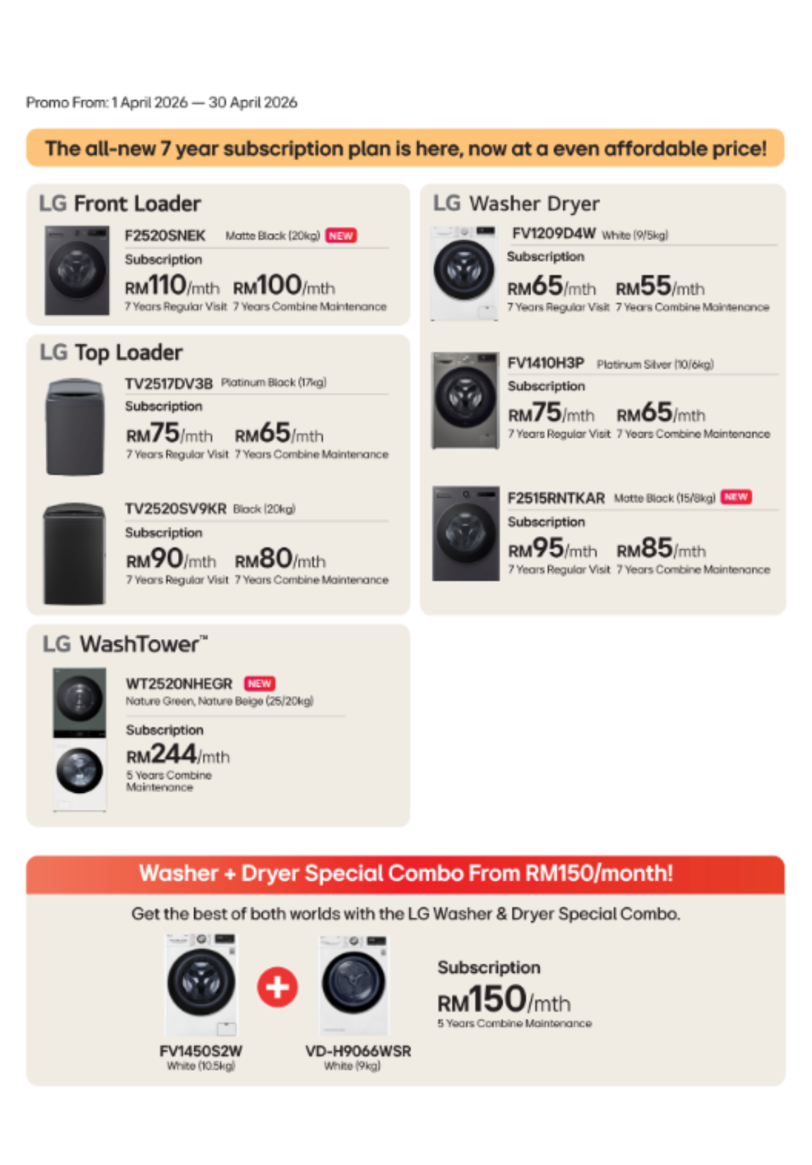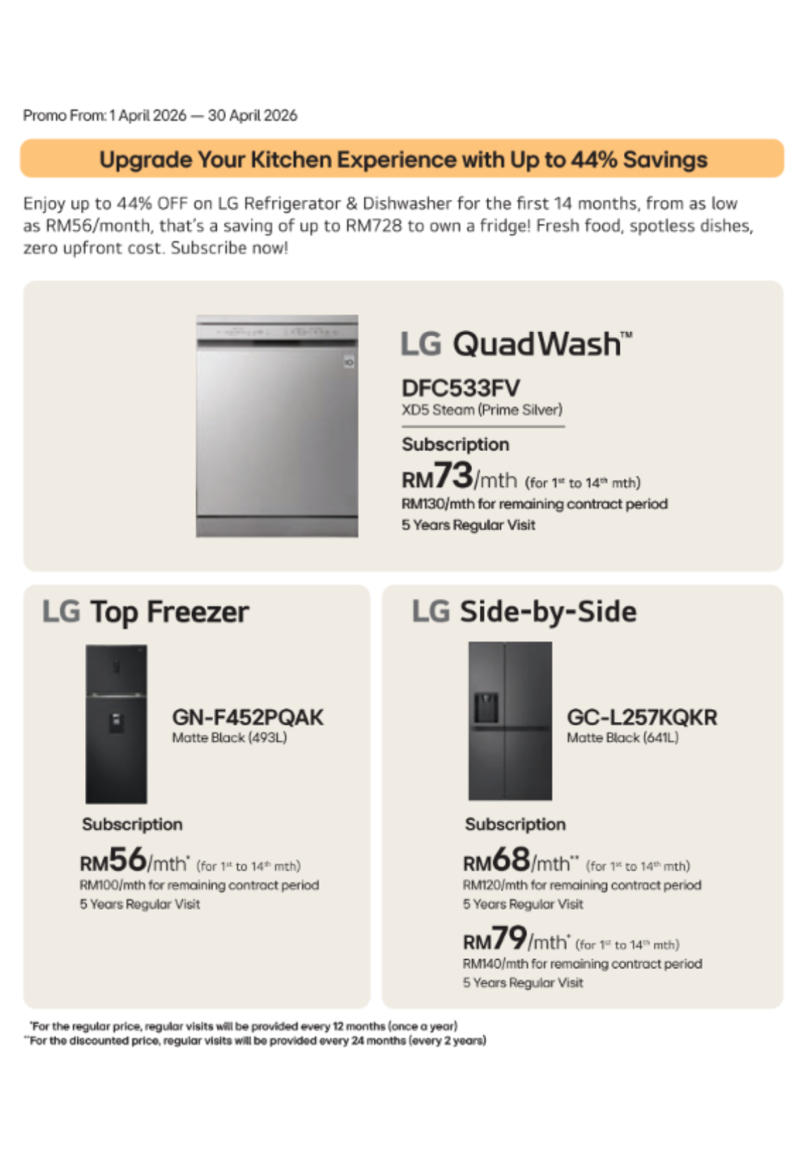 Enjoy up to 44% OFF on LG Refrigerator & Dishwasher for the first 14 months, from as low as RM56/month, that’s a saving of up to RM728 to own a fridge! Fresh food, spotless dishes, zero upfront cost. Subscribe now!